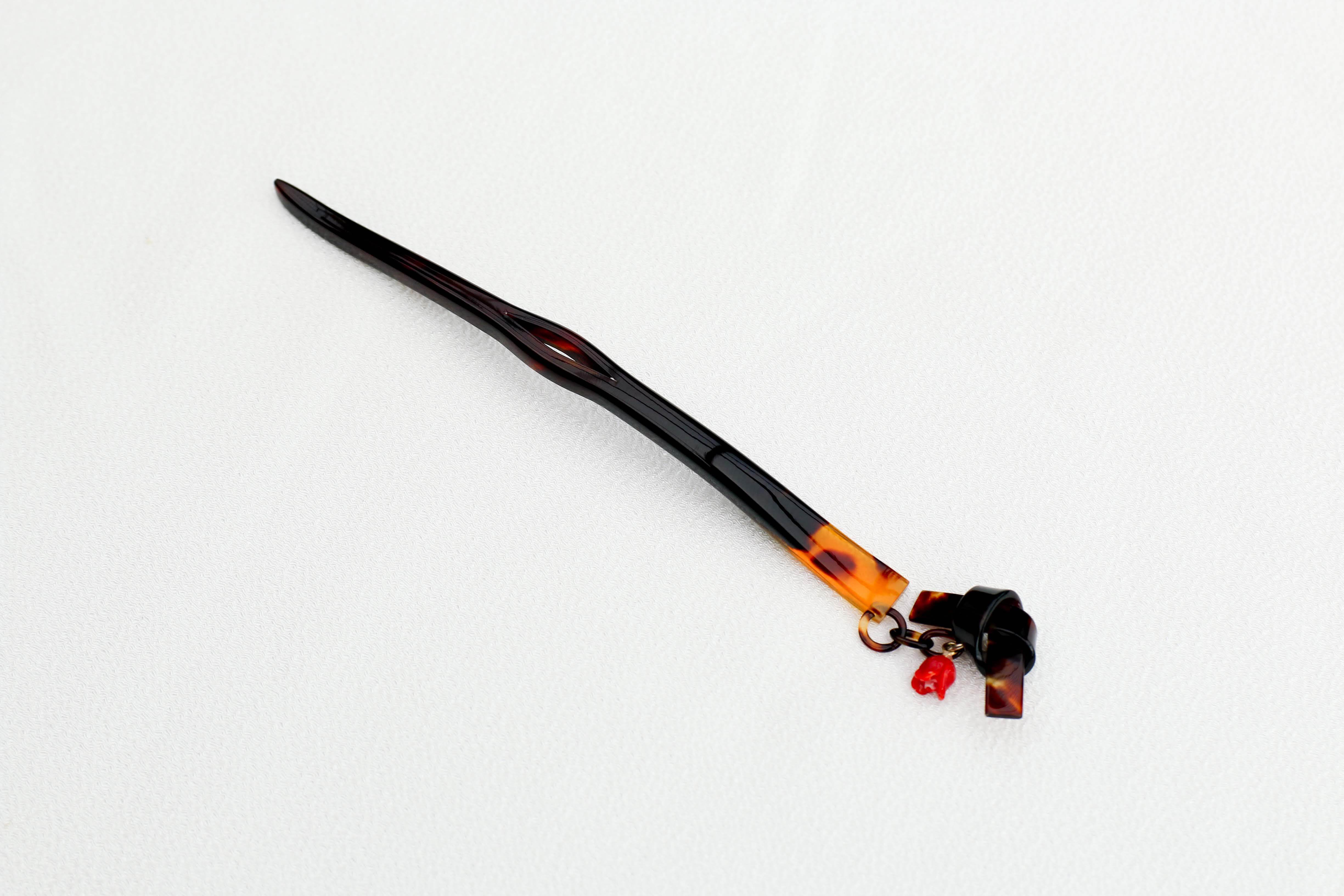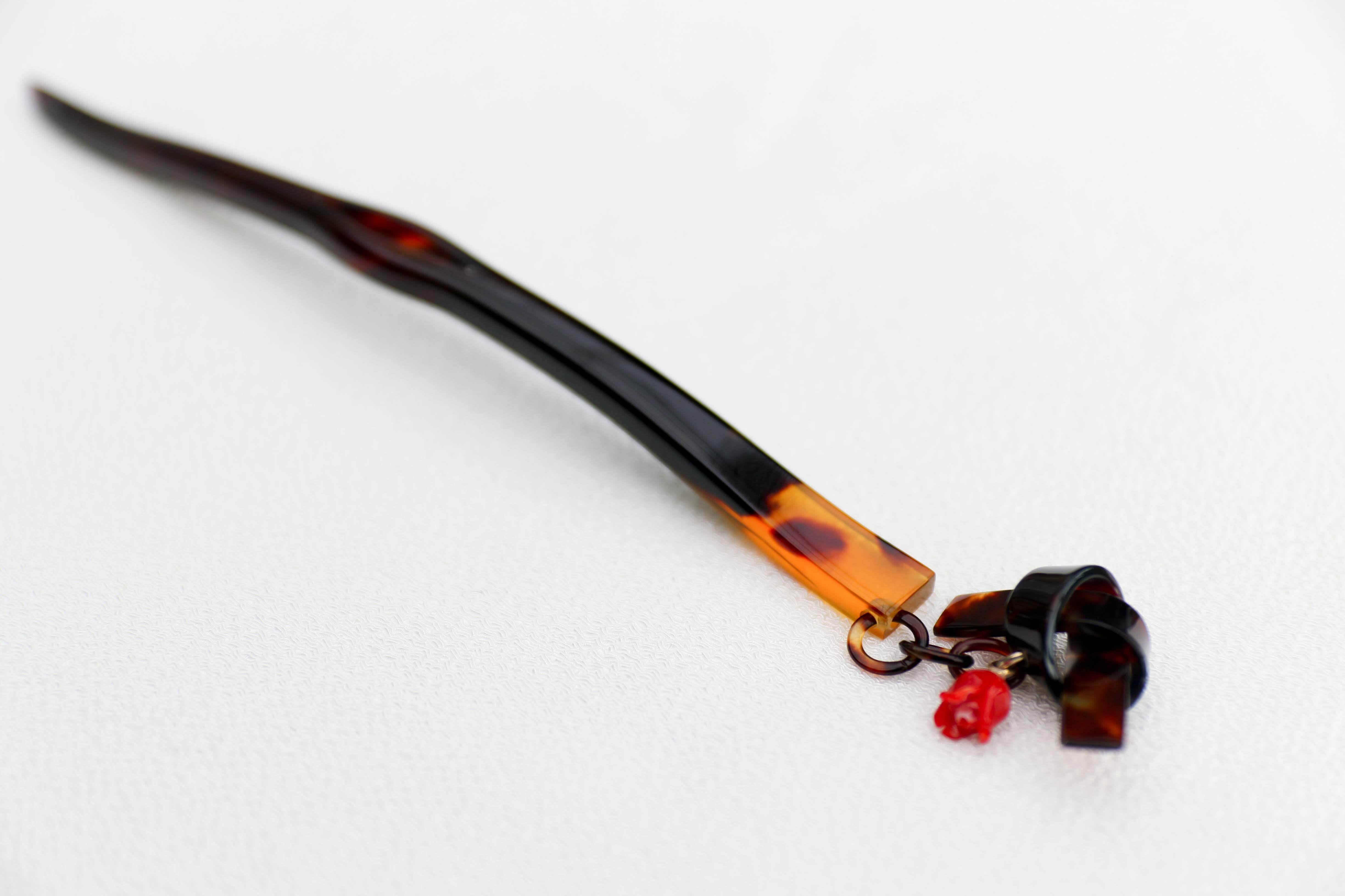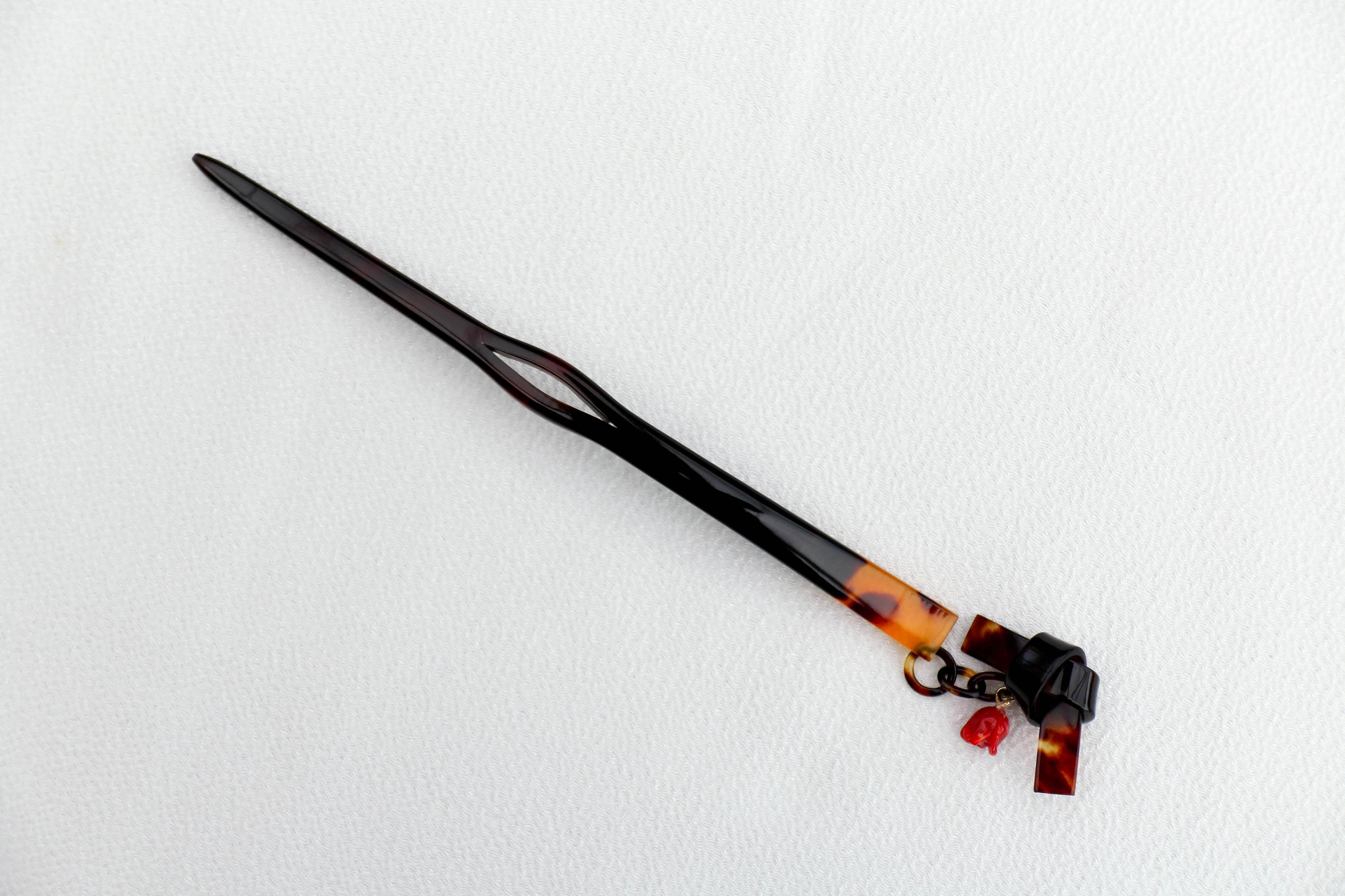 【奈良べっ甲】バラ赤珊瑚付リボン一本足かんざし